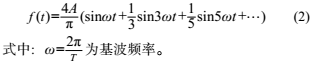 針對(duì)傳感器輸出信號(hào)的特點(diǎn),顯然可知其是由基波頻率和奇次諧波疊加而成的。對(duì)于一個(gè)給定單峰值為A的矩形波信號(hào),其傅里葉展開(kāi)有如下形式: