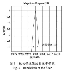 由帶通濾波器的通頻帶定義可知,存在兩個(gè)截至頻率fH和fL,當(dāng)信號(hào)頻率上升到fH或者下降到fL時(shí),使得輸出信號(hào)從*大值衰減3dB。圖3所示為通帶帶寬為1Hz的梳狀帶通濾波器局部放大圖。
