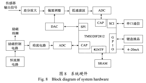 以TI公司的TMS320F2812 DSP芯片研制了電磁流量計(jì)系統(tǒng),它是一塊具有150MIPS的指令速度的32位定點(diǎn)計(jì)算能力的芯片,有較高的計(jì)算精度,能夠滿(mǎn)足數(shù)字信號(hào)處理算法的要求,可對(duì)信號(hào)進(jìn)行實(shí)時(shí)處理。且集成了豐富的片上外設(shè),便于以后系統(tǒng)功能的擴(kuò)展。硬件框圖如圖8所示,主要由勵(lì)磁驅(qū)動(dòng)模塊、信號(hào)調(diào)理采集模塊、信號(hào)處理控制模塊、人機(jī)接口模塊、通信模塊和電源管理模塊組成。