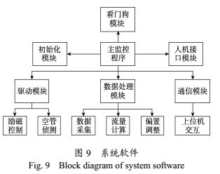 系統(tǒng)軟件設(shè)計(jì)采用模塊化設(shè)計(jì)方案,由主監(jiān)控程序程序統(tǒng)一調(diào)用。軟件總體框圖如圖9所示。系統(tǒng)軟件包含的主要功能模塊有:初始化模塊、驅(qū)動(dòng)模塊、數(shù)據(jù)處理模塊、通信模塊、看門(mén)狗模塊和人機(jī)接口模塊等。