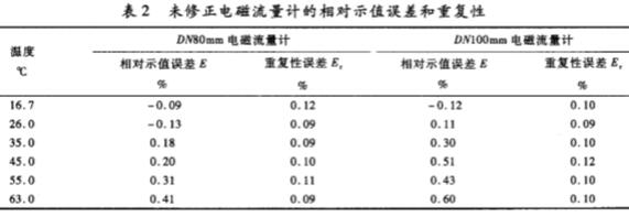 根據(jù)JJG1033—2007,DN80mm和DN100mm電磁流量計在不同溫度下的相對示值誤差和重復(fù)性見表2??梢钥闯?,當(dāng)流體溫度在16.7—30.0℃時,電磁流量計的相對示值誤差在40.13%以內(nèi),筆者認為在此溫度范圍內(nèi),介質(zhì)溫度變化對電磁流量計的影響可以忽略。當(dāng)流體溫度在30~63℃時,電磁流量計的相對示值誤差正差偏,*大誤差為0.60%,對于DN100mm的電磁流量計,其相對示值誤差已經(jīng)超出了0.5級電磁流量計的精度范圍。因此,當(dāng)電磁流量計用于高溫環(huán)境的高精度測量時,介質(zhì)溫度的影響-定不能忽略。