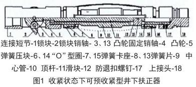 可預收緊型井下扶正器分別連接在電磁流量計的上端與下端,構成上下扶正器,下井前用手或專用收緊工具,橫向上壓縮固定在彈簧卡座總成上4組彈簧片,在外力作用下簧片徑向收縮,在收縮過程中帶動彈簧卡座徑向位移,撥動滑塊,頂桿向上徑向位移,同時轉動凸輪,當凸輪邊緣上的球面凹坑與頂桿成水平線時松開頂桿,頂桿下端圓球面與凸輪上的球面凹坑偶合,松開4組彈簧片,此時彈簧片處于收緊狀態(tài),將儀器裝入防噴管內(nèi),打開測試閘門儀器即可下井,如圖1所示。