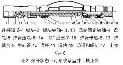 下井的儀器帶動測井鋼絲下行 [2] ,通過井下偏心配水器時,凸輪上的鎖塊克服鎖塊扭簧的扭力作用向上翻轉,儀器可以順利通過偏心配水器,當下到井筒內(nèi)任何一級偏心工作筒下方時,地面絞車上提儀器,儀器上行經(jīng)過偏心配水器,鎖塊帶動凸輪順時針旋轉,頂桿球面與凸輪球面凹坑偶合脫開,頂桿上的滑塊在彈簧片彈力作用下向下位移帶動頂桿進入到凸輪凹腔內(nèi),同時扶正器上4個彈簧片在彈力作用下張開貼附在油管內(nèi)壁上(見圖2)保證了儀器在油管內(nèi)居中,然后按照測試方案即可分層流量測試。