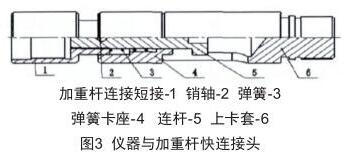 (3)研制的儀器與加重桿快連接頭,把原一體化連接結構,改為分體結構,儀器在井口防噴裝置內(nèi)放入、取出方便,在保證儀器整體長度大體不變的情況下,降低了操作工人把儀器放入、取出井口防噴裝置的上舉高度,降低了在井口操作時存在的安全風險。
