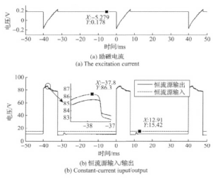 由圖7曲線結合圖2可知,在勵磁方向切換后,檢流電路檢測到的圖7(a)中的勵磁電流瞬間為負,此時勵磁線圈處于電能泄放狀態(tài)并向能量反饋電路中的儲能電容充電。由于儲能電容充電,高、低壓切換電路的輸出電壓從80V逐漸升高;待勵磁線圈能量泄放完即勵磁電流為零時,儲能電容兩端電壓達到*高86V并開始放電,勵磁電流開始上升;儲能電容電壓降低至80V時,高低壓切換電路趨于80V的穩(wěn)定輸出狀態(tài),此時勵磁電流繼續(xù)上升;待勵磁電流上升至設定的超調量205 mA后,遲滯比較電路控制高低壓切換電路切換至17V低壓源作為勵磁工作電源,恒流電路在17V低壓源輸入下進行恒流控制輸出。