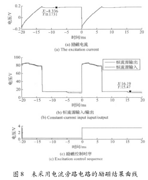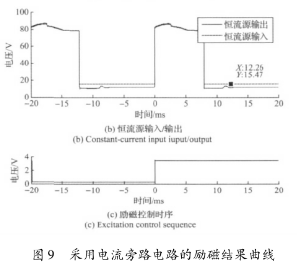 實驗結果表明,高壓源向低壓源切換后,三端穩(wěn)壓器的工作特性致使的電流波動和低壓源供電情況下的恒流控制,會大幅延長勵磁電流的穩(wěn)態(tài)響應時間。圖8所示勵磁電流約在17ms左右進入穩(wěn)態(tài),圖9所示勵磁電流的穩(wěn)態(tài)響應時間約為12ms。這表明,在采用三端穩(wěn)壓器搭建恒流控制電路的情況下,電流旁路電路能有效克服三端穩(wěn)壓器工作特性的影響,并能方便的實現(xiàn)電流超調,加快勵磁電流的響應速度。