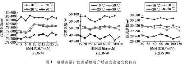 (1) 隨著介質(zhì)溫度的升高,煤礦排水流量計(jì)的儀表系數(shù)均呈逐漸降低的趨勢(shì)。其中20℃和50℃的儀表系數(shù)基本相同,10℃和80℃的儀表系數(shù)與20℃時(shí)偏離較大。