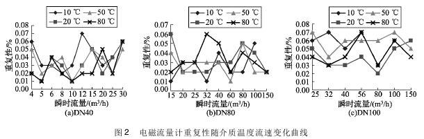 將實(shí)驗(yàn)測(cè)得的煤礦排水流量計(jì)在不同溫度及流速下的重復(fù)性數(shù)據(jù)整理,特性曲線如圖2所示,3組曲線分別對(duì)應(yīng)DN40、DN80、DN100的3塊煤礦排水流量計(jì)的重復(fù)性曲線。