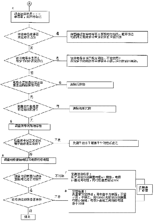 檢查流程圖*5項。信號回路絕緣下降會形成零點不穩(wěn)。信號回路絕緣下降的土要原因足,包*部位絕緣下降所引起的,但也不能排除信號電纜及其接線端子絕緣下降或破壞。因為有時候現(xiàn)場環(huán)境十分嚴酷,稍一疏忽儀表蓋、導線連接處密封不慎,彌漫著潮氣酸霧或粉粒塵埃侵入儀表接線盒或電纜保護層,使絕緣卜降。信號回路絕緣電阻檢查分別按電纜側(cè)和流量傳感器側(cè)兩郵分進行,用兆歐表測試。因信號電纜容易可先做。流量傳感器再分兩次進行:充滿液體測黽電*表面接觸電阻和個管后測量,U*絕緣電阻。