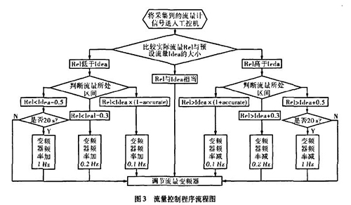 實際生產(chǎn)中流量一直在某個區(qū)域內(nèi)波動,且其動態(tài)特性不易掌握。從上面的理論中我們能夠讓誤差△£盡可能的小,這樣距我們所需要的理論值%就越接近。而減小誤差需要我們把n取的盡可能大,也就是在生產(chǎn)時間內(nèi)劃分更多的周期去調(diào)節(jié)流量。當(dāng)工控機根據(jù)防爆型電磁流量計價格傳送回來的信號發(fā)出調(diào)節(jié)變頻器工作頻率的指令后,電機調(diào)整功率到防爆型電磁流量計價格的實際測量為一個工作周期,我們知道從指令發(fā)送到實際測量值返回有一個較大的滯后,如果調(diào)節(jié)的周期時間小于流量計本身的一個工作周期,那么顯然不可能達到減小誤差的目的。利用模糊控制思想H。,在控制程序中我們把流量的波動區(qū)域劃分為±缸×Yo,Yo-t-O.3,Yo±0.5四個區(qū)域,其中缸為可調(diào)節(jié)的誤差范圍,生產(chǎn)中我們?nèi)?.015,流量區(qū)域劃分的單位均為t/h。針對不同的區(qū)域采取不同的調(diào)整方案。具體流程如圖3所示。圖中變量Rel表示實際測量的流量,變量Idea表示理論流量。
