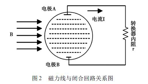2. 1 正交干擾管道污水電磁流量計(jì)的磁路系統(tǒng)包含有兩個(gè)勵(lì)磁線圈,而導(dǎo)管內(nèi)的液體與傳感器電*及轉(zhuǎn)換器結(jié)構(gòu)組成了一個(gè)閉合的回路,如圖2 所示。理論情況下,磁力線( 圖中B) 應(yīng)與閉合回路相平行,但是由于裝配過(guò)程中的誤差,導(dǎo)致磁力線不可能完全平行于這一閉合回路,出現(xiàn)部分磁力線成一定角度穿過(guò)回路的現(xiàn)象,這引起了即使沒(méi)有液體流動(dòng)的情況下,傳感器的電*上也會(huì)產(chǎn)生感應(yīng)電動(dòng)勢(shì),就形成了正交干擾的基本形式。