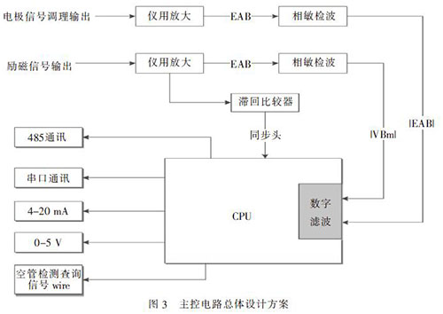 電*檢測出的微弱感應(yīng)電動勢E, 先經(jīng)前置放大器的放大和噪聲抑制而成為大幅度低阻抗的電壓信號。此信號經(jīng)相敏檢波后,給CPU 進(jìn)行數(shù)字濾波、處理和控制,通過利用雙線性變換法將模擬的二階巴特沃斯低通濾波器轉(zhuǎn)換為數(shù)字式濾波器,既簡化電路設(shè)計,且可靠性高、穩(wěn)定性好。通過編寫軟件CPU 能對放大器的溫度漂移及零點漂移給予補(bǔ)償, 并在測量的全量程范圍內(nèi)分10 段對信號進(jìn)行非線性修正,使得測量值更好地擬合真實數(shù)據(jù)??展軝z測電路上,CPU 作為從控制器。當(dāng)主控制電路上發(fā)出空管檢測查詢信號wire, 從控制器進(jìn)行識別后接收并判斷出查詢什么信號,然后產(chǎn)生應(yīng)答信號上傳至主控芯片輸出顯示;當(dāng)檢測為空管信號時, 從CPU 發(fā)出的zero 信號通過控制MOS 管開關(guān)來關(guān)斷流速輸出。在應(yīng)用中,對于微弱信號的放大及提取還需注意PCB 板設(shè)計時EMI 電磁屏蔽考慮,屏蔽來自空間磁場的干擾、周邊設(shè)備的輻射造成的干擾和板內(nèi)之間的干擾,如數(shù)模分離、強(qiáng)弱電分離等等。