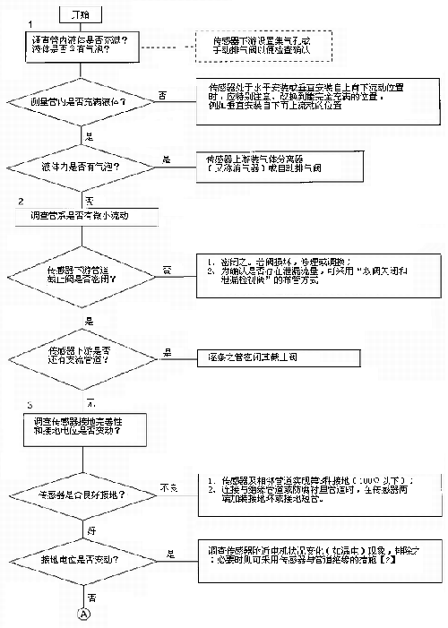 檢查流程圖*5項(xiàng)。信號回路絕緣下降會形成零點(diǎn)不穩(wěn)。信號回路絕緣下降的土要原因足,包*部位絕緣下降所引起的,但也不能排除信號電纜及其接線端子絕緣下降或破壞。因?yàn)橛袝r(shí)候現(xiàn)場環(huán)境十分嚴(yán)酷,稍一疏忽儀表蓋、導(dǎo)線連接處密封不慎,彌漫著潮氣酸霧或粉粒塵埃侵入儀表接線盒或電纜保護(hù)層,使絕緣卜降。信號回路絕緣電阻檢查分別按電纜側(cè)和流量傳感器側(cè)兩郵分進(jìn)行,用兆歐表測試。因信號電纜容易可先做。流量傳感器再分兩次進(jìn)行:充滿液體測黽電*表面接觸電阻和個(gè)管后測量,U*絕緣電阻。