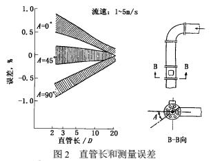 2000年上海原水公司擬在已建成的某泵站加裝DN2200液堿流量表,但彎管下游安裝位置的前直管長度明顯不符合規(guī)定中5D~10D(D為管徑,下同)的要求,此時(shí),影響測量誤差有多大呢?