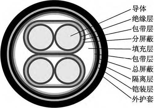 該新型電纜的結構如圖1所示。導體為單股退火鍍錫軟銅線,以提高導體的導電性和防腐蝕性。在導體外繞包一層?。疲矗ň鬯姆蚁┌雽щ妿В欣诮档蛯w和絕緣之間的摩擦起電噪音。絕緣采用材料較為純凈、介電常數(shù)較小、具有一定彈性的聚丙烯絕緣級材料,并采用擠壓式擠出,減小絕緣層與導體的間隙。采用對絞組作為信號傳輸線,由于在兩根傳輸線上感應的電壓接近相等,減小了電壓差值,提高了信號傳輸穩(wěn)定性;對絞組由兩種不同顏色絕緣線芯組成,相鄰線對對絞節(jié)距應不大于100mm。對絞分屏蔽組(即對對絞組進行分屏蔽,每對對絞組外繞包兩層聚酯帶和一層厚0.04mm鋁塑復合帶繞包,內(nèi)置一根7×0.26mm鍍錫銅絞線作引流線)有利于對不同對絞組之間信號串音的抑制和隔離。對絞分屏蔽組同心式絞合成纜,在對絞分屏蔽組間填充非吸濕性材料,以保證纜芯圓整。在成纜纜芯外繞包兩層聚酯帶,再采用鋁塑復合帶繞包,內(nèi)置鍍錫銅線作引流線,以提高電纜電磁屏蔽能力??偲帘螌油鈹D包隔離層(隔離護套),隔離層采用絕緣級低密度聚乙烯材料。隔離層外采用鎧裝層,鎧裝材料為高導磁合金鋼帶,其為強磁材料,可將外來的磁通大部分限制在鎧裝層的外表面上(僅有少部分能進入被屏蔽的空間);鎧裝時對高導磁合金鋼帶采用縱包焊接,確保其形成一連續(xù)圓柱管;鎧裝層可提高電纜抗電磁干擾水平以及對電纜進行加強,減少電纜振動引起的電動勢。外護套采用藍色軟PVC(聚氯乙烯)護層級電纜材料擠包,實現(xiàn)電纜防護。