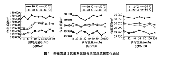 將實(shí)驗(yàn)測(cè)得的水泥計(jì)量表在不同溫度及流速下的儀表系數(shù)數(shù)據(jù)整理,特性曲線如圖1所示,3組曲線分別對(duì)應(yīng)DN40, DN80, DN100的3塊水泥計(jì)量表的儀表系數(shù)曲線。