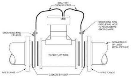 晶片式流量管:將晶片式流量管安裝在非金屬,塑料,PVC或帶襯里的工藝管道之間時(shí),需要接地環(huán)。必須通過(guò)將隨附的隨附的SG連接線連接到接地環(huán),將SG傳遞到流量管的主體/外殼上(圖6.)。
