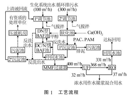 2種廢水在中間水池混勻后,通過泵提升進入保安過濾器,進一步去除細小的懸浮物后經(jīng)過增壓泵進入超濾膜(UF)處理系統(tǒng)和反滲透(RO)系統(tǒng),然后通過水廠流量計進行計量。反滲透出水直接進入回用水池達標回用,超濾濃水以及反滲透濃水用作水煤漿混合用水。污泥池中的污泥通過泵打入帶式機壓濾處理,濾液自流進入1#調(diào)節(jié)池。工藝流程見圖1。