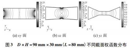 2) 圖 4( a) 、圖 5( a) 的 xy 面權(quán)函數(shù)分布表明,H = 30 mm時中心區(qū)域的權(quán)函數(shù)等勢線間距較大,且中心區(qū)域的權(quán)函數(shù)等勢線逐漸變?yōu)橹本€; 電*附近的權(quán)函數(shù)等勢線比較稀疏,且等勢線顏色較淺,權(quán)函數(shù)*大值較小,變化梯度小,因 此,H = 30 mm 時 xy 面的權(quán)函數(shù)分布更加均勻。