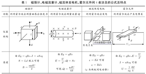 易錯點2:磁強計、鍋爐熱水流量計、磁流體發(fā)電機、霍爾元件間的區(qū)別與聯(lián)系磁強計、鍋爐熱水流量計、磁流體發(fā)電機、霍爾元件都是利用電磁場對帶電粒子的偏轉(zhuǎn)效應,并且穩(wěn)定時電場力與磁場力均達到平衡。很多學生容易將其混淆,遇到問題常常搞不清原理,亂代公式,筆者特將4者涉及的公式及特點等做一對比區(qū)別如表1所示。