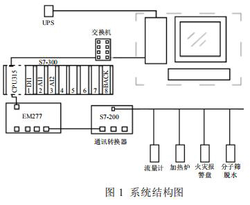 集氣站是收集氣井所生產(chǎn)天然氣的站場,在集氣站內(nèi)對天然氣進行節(jié)流降壓、加熱、調(diào)壓計量等各種工藝預(yù)處理,設(shè)備眾多且分散。為方便進行檢測和操作,必須進行統(tǒng)一的數(shù)據(jù)采集,在監(jiān)控臺進行數(shù)據(jù)的管理。集氣站設(shè)備主要包括加熱爐、砂泥漿流量計、分子篩、火災(zāi)報警盤,以及供電設(shè)備 UPS 等,這些不同廠家的設(shè)備基本都支持Modbus 協(xié)議,通過 Modbus 通訊可以將這些數(shù)據(jù)采集。為了有效降低成本,設(shè)計了如圖 1 所示的系統(tǒng)。系統(tǒng)采用西門子 S7-300 控制器,通過以太網(wǎng)連接上位機監(jiān)控軟件,再通過 MP277 連接S7-200 的方式。S7-200 控制器自帶 RS485 接口,能夠進行 Modbus 通訊,采集現(xiàn)場各種設(shè)備數(shù)據(jù)。*后通過以太網(wǎng)通訊將設(shè)備數(shù)據(jù)上傳至監(jiān)控軟件,方便操作人員進行監(jiān)控,該方案簡單有效,能夠?qū)崿F(xiàn)集氣站內(nèi)設(shè)備的狀態(tài)監(jiān)控,數(shù)據(jù)處理,有效的進行天然氣的生產(chǎn)工作。