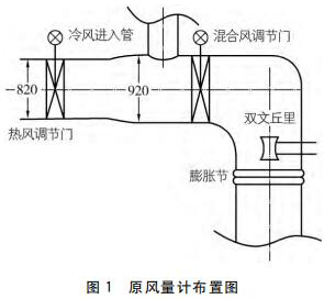 從流量測量角度講,影響流場的主要為熱風(fēng)調(diào)門、擴(kuò)管、彎頭以及一次冷風(fēng)的混入,閘板門和混合風(fēng)調(diào)門由于運行時處于全開狀態(tài),影響可忽略,目前使用了單點雙文丘里管的測量方式,有以下問題:
