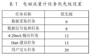 下面以電磁流量計(jì)為例說(shuō)明基于 μC/OS-III 的人機(jī)界面設(shè)計(jì)。 先將 μC/OS-III 移植到 Cortex-M3 處理器上,這里選用的是 STM32F103VET6 。電磁流量計(jì)的應(yīng)用程序若按照上節(jié)的任務(wù)種類(lèi)劃分有: 數(shù)據(jù)采集任務(wù)、數(shù)據(jù)處理任務(wù), 4~20mA輸出任務(wù), Hart 通訊任務(wù)以及用戶(hù)交互任務(wù)。 先對(duì)不同的任務(wù)進(jìn)行優(yōu)先級(jí)的劃分,如表 1 所示。
