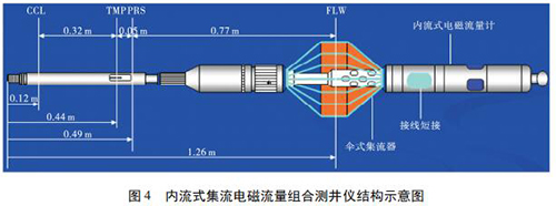 1. 2 內(nèi)流式集流燒堿流量計如圖 4 所示,內(nèi)流式集流電磁組合測井儀主要采用內(nèi)流式集流燒堿流量計,并組合了井溫壓力磁定位儀。利用電磁感應(yīng)原理測量平均流速,體積流量計算公為: