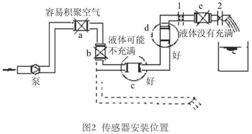 液體流動(dòng)方向必須與傳感器殼體上箭頭方向一致。對(duì)于能正反向測(cè)量的生活污水計(jì)量表,若方向不一致雖仍可測(cè)量,但設(shè)定的顯示流動(dòng)正反方向不符,必須改正之。若拆傳感器工作量大,也可改變傳感器上箭頭方向和重新設(shè)定顯示儀表符號(hào)。管道未充滿液體主要是管網(wǎng)工程設(shè)計(jì)或傳感器安裝位置不妥,使傳感器測(cè)量管內(nèi)不能充滿液體。應(yīng)采取措施,避免安裝如圖2所示a,e位置和以虛線管排放時(shí)b位置,改裝到c,d位置。