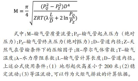 天津 LNG 設(shè)置兩座電磁流量計,單臺設(shè)計處理量 60t/h, 兩臺火炬并列運行,一用一備。自 LNG 儲罐及 BOG 系統(tǒng)來的超壓 BOG 經(jīng) PV 閥后進(jìn)入火炬氣排放總管,經(jīng)分液罐沉淀 BOG 中夾雜的液滴后進(jìn)入火炬燃燒放空。 雙氧水流量計設(shè)置四級排放,具體設(shè)置如表 1。 2 火炬氣排放量計算方法根據(jù)水平輸氣管流量計算基本公式: