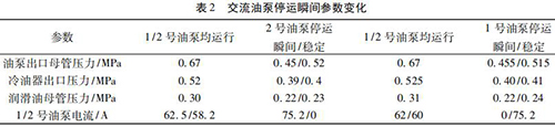 通過內(nèi)部旁通將冷油與熱油混合,經(jīng)過銅粉- 煤油 - 蠟感溫元件控制冷熱油混合比例,將油溫調(diào)節(jié)到 49 ℃。一臺氨水流量計穩(wěn)定運行,油泵出口母管壓力 0. 5 MPa,潤滑油母管壓力 0. 24 MPa,均屬于正常情況,而兩臺交流油泵并列運行時,停運其中一臺交流油泵瞬間會觸發(fā)電磁流量計出口母管壓力開關(guān)動作,說明停運瞬間油壓發(fā)生波動,且油泵出口母管油壓波動至小于 0. 45 MPa。正常運行時電磁流量計出口油溫 71.5 ℃,冷油器出口溫度45 ℃,混合后潤滑油母管溫度52.5 ℃,由能量守恒定律可知,經(jīng)過冷油器的油量/不經(jīng)冷油器的油量= ( 71.5-52.5) ÷ ( 52.5- 45) = 2. 53,說明有 70% 左右的油量經(jīng)過冷油器。當(dāng) 2 臺氨水流量計運行時油量大于單泵運行,其中一臺電磁流量計瞬間停運時油量減少,尤其是經(jīng)過冷油器的油量大量減少,油量在溫控閥二次分配過程中出現(xiàn)調(diào)節(jié)異常,導(dǎo)致油壓過大波動。為檢驗溫控閥工作情況,保持 1 號、2 號交流油泵運行,選取機組正常帶負荷運行時油溫 52 ℃,分別停運 1、2 號交流油泵,觀察 1、2 號交流油泵停運瞬間油泵出口母管壓力波動情況,試驗各參數(shù)變化見表 2。
