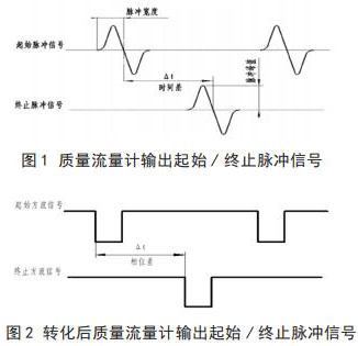 將循環(huán)水流量計流量與相關(guān)測試設(shè)備連接起來,就可以進(jìn)行循環(huán)水流量計的校準(zhǔn),時間差△ t 由專用試驗測試設(shè)備可以測出。起始脈沖信號和終止脈沖信號如圖 1 所示。經(jīng)過專用試驗測試設(shè)備信號轉(zhuǎn)化后的信號方波如圖 2 所示。