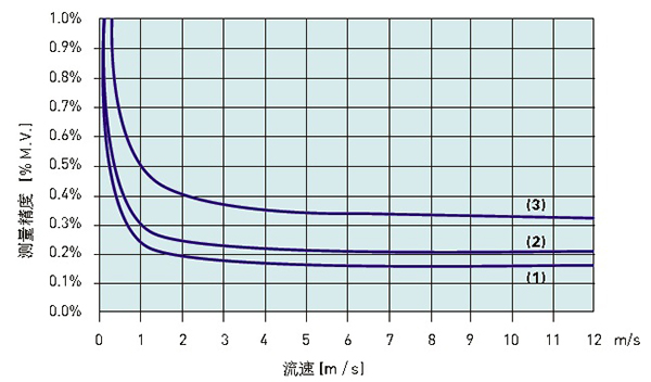原水流量計實質(zhì)是測量介質(zhì)的流速,它是速度式流量計。一般原水流量計推薦流速在0.3m/s-5m/s,在這個范圍內(nèi),流量計測量精度高、線性好、水力損耗小、介質(zhì)對流量計傳感器襯里和電*的磨損也較小。以某品*原水流量計選型樣本提供的流速曲線為例(見圖3),可以看出流量越小、流速越慢,測量誤差越大,曲線在0.3m/s處存在拐點。