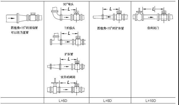 得出圖3的流速曲線有一個前提條件,就是保證流量計前后直管段的要求。為了使流過傳感器介質(zhì)流態(tài)穩(wěn)定,測量精度不受流速分布影響,通常對流量計直管段長度要求上游10D、下游5D(D為原水流量計口徑),如圖4所示。直管段是從原水流量計傳感器中點算起,并是不很多人以為的法蘭連接處算起。
