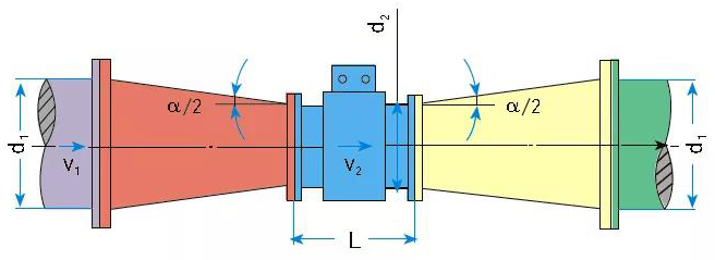 所以在有些流速偏低工況下,為了使原水流量計工作在合適的流速范圍,允許有一定的壓力損失時,可以選擇流量計傳感器的口徑小于管道口徑,在儀表前后增加異徑管,提高介質(zhì)流速。異徑管的中心錐角α不大于15°,可以視為直管,如圖5。
