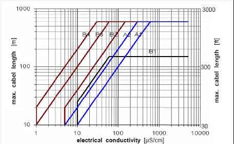 以某品*原水流量計選型樣本提供的電導(dǎo)率和電纜長度曲線為例,其中A型電纜為雙芯雙屏蔽DS300、B型電纜為雙芯三屏蔽BTS300。像浙江省一般水庫原水電導(dǎo)率在100us/cm左右,安裝所需電纜線小于100米,選A型即可,超過100米,需要選B型。