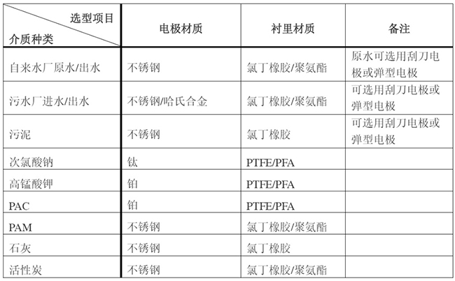 電*對被測量介質(zhì)的耐腐、抗磨蝕、無電化學(xué)反應(yīng)是選擇材質(zhì)考慮的因素。常用金屬材料有含鉬耐酸鋼、哈氏合金B(yǎng)、哈氏合金C、鈦、鉭、鉑銥合金等。由于介質(zhì)種類繁多,其腐蝕性又受溫度、濃度、流速等復(fù)雜因素影響而變化,生產(chǎn)廠僅能給出很粗略的各種電*的適用范圍。電*材質(zhì)的選擇可從使用者借鑒該介質(zhì)在其他設(shè)備的應(yīng)用實例和以往的經(jīng)驗來確定。浙江某自來水廠用于計量5-10%次氯酸鈉投加,電*材質(zhì)選擇了哈氏合金,在運行使用1年多的時間后,出現(xiàn)傳感器故障,返廠檢測發(fā)現(xiàn)電*腐蝕,后我司選擇鈦電*材質(zhì),現(xiàn)運行情況良好。水行業(yè)常規(guī)選型詳見表2。