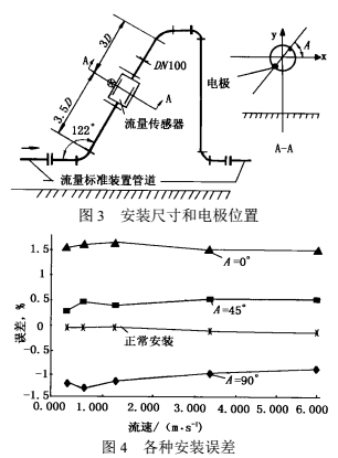 除儀表前直管段可降低彎管影響外,人們還從安裝方式上設(shè)法降低影響的方法。文獻(xiàn)曾報道電磁流量傳感器電*軸線與鄰近彎管平面成45°傾斜安裝可以減少彎管影響。日本工業(yè)標(biāo)準(zhǔn)B7554“解說部分”列有電*軸線與彎管平面垂直、平行、成45°三種安裝方式,在不同長度直管下的測量誤差范圍,也說明這一效果。
